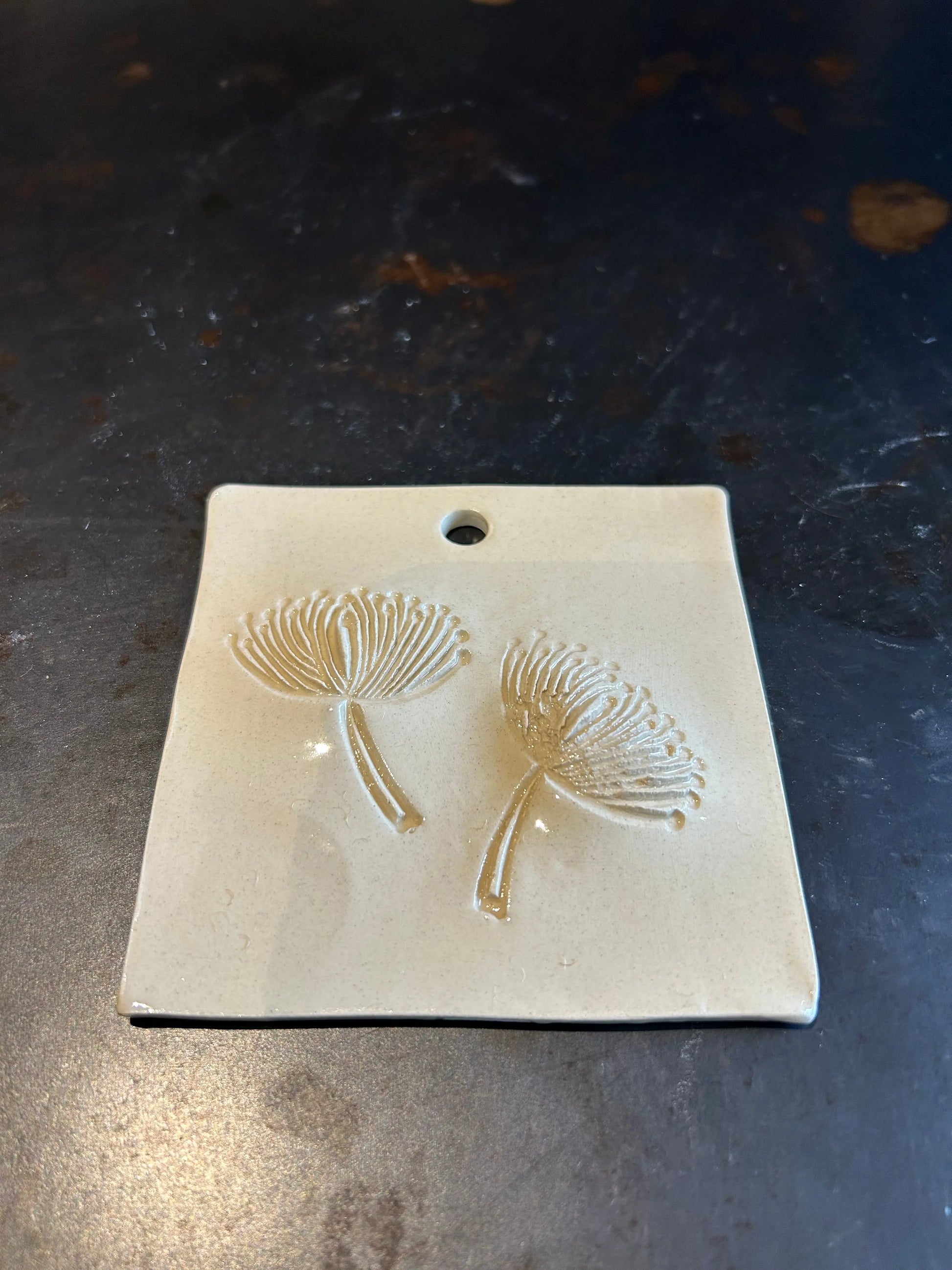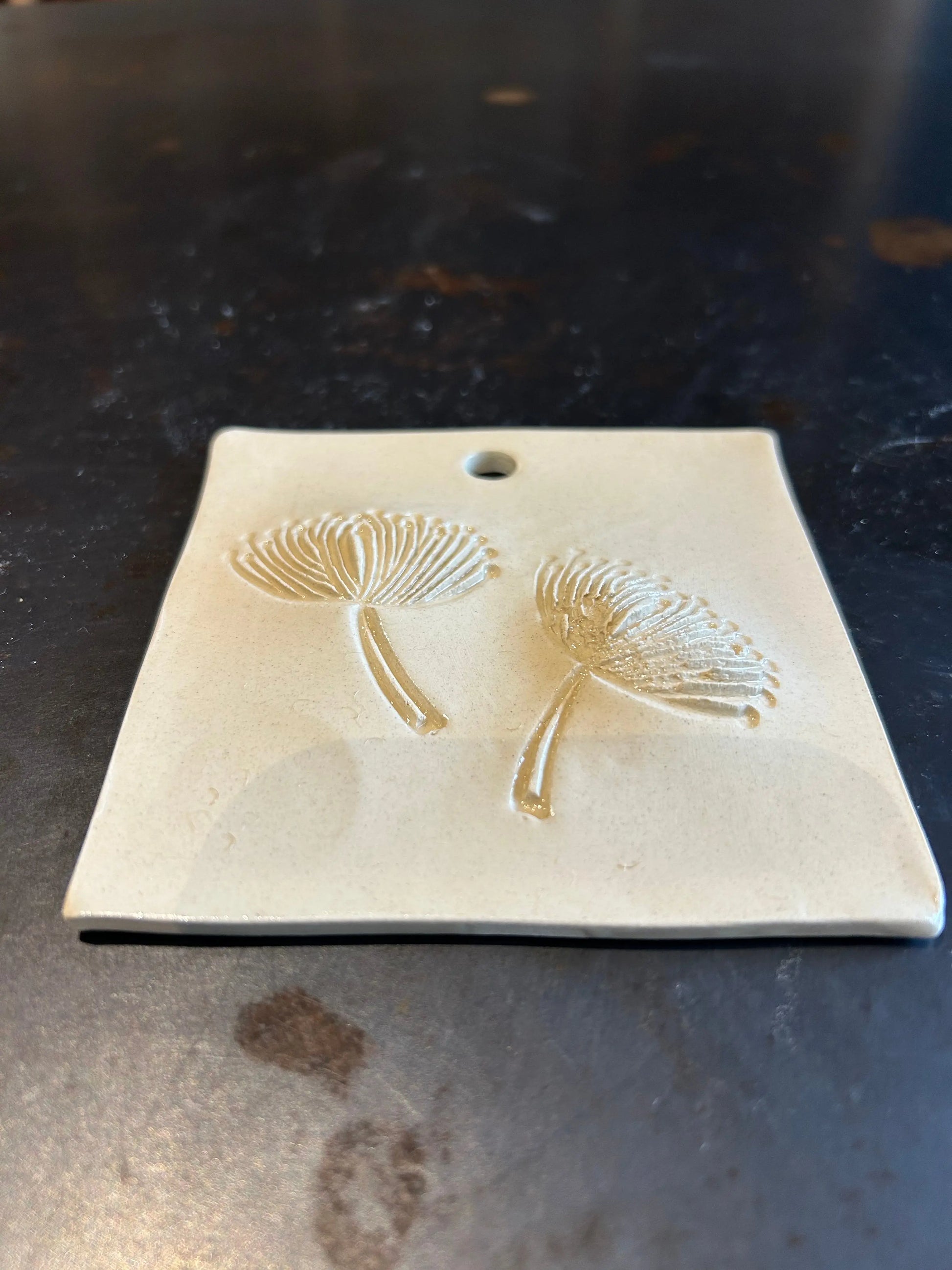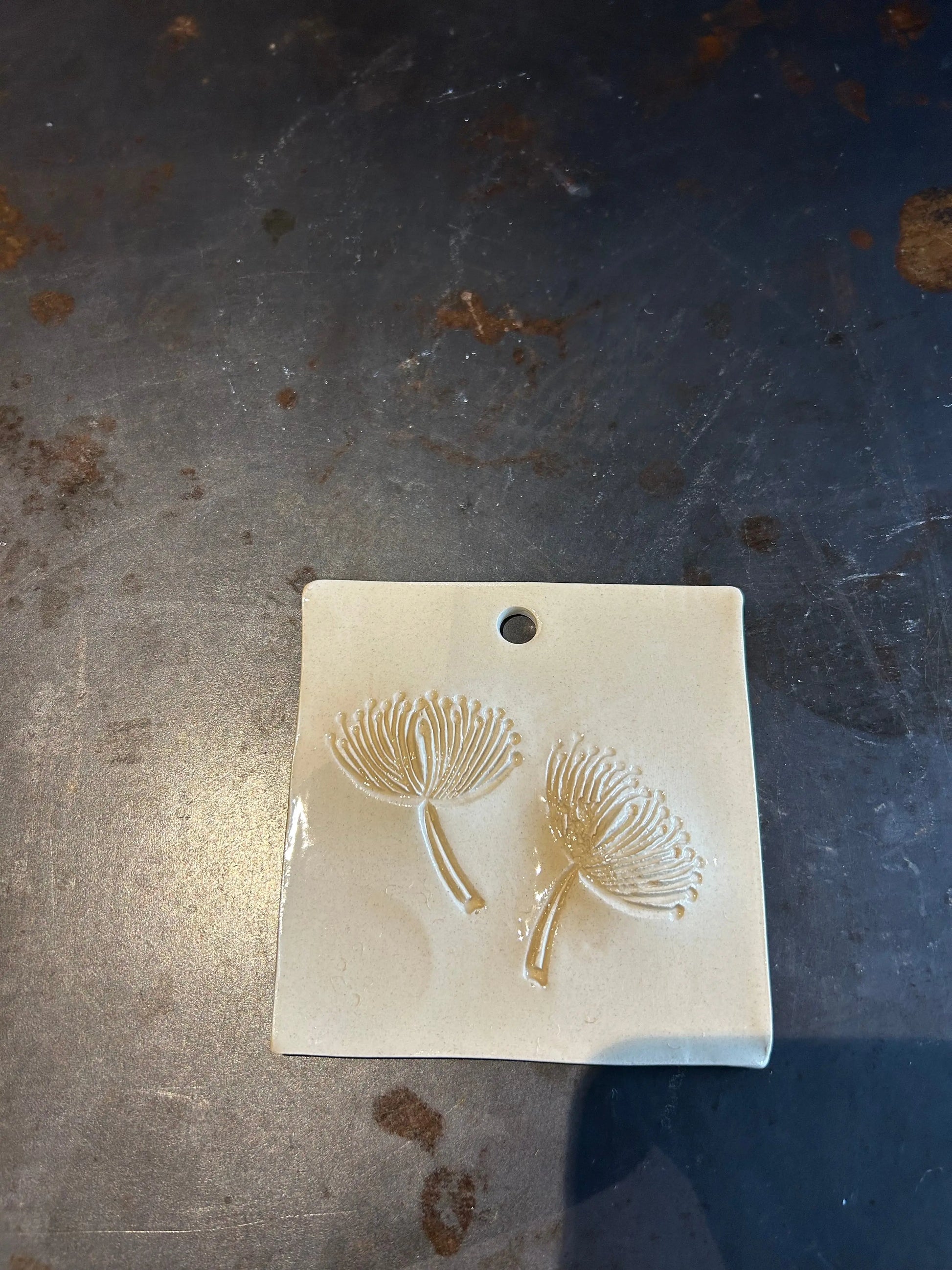 Plaque murale décorative, léger relief des fleurs , en grès blanc lisse , émaillé transparent blanc.