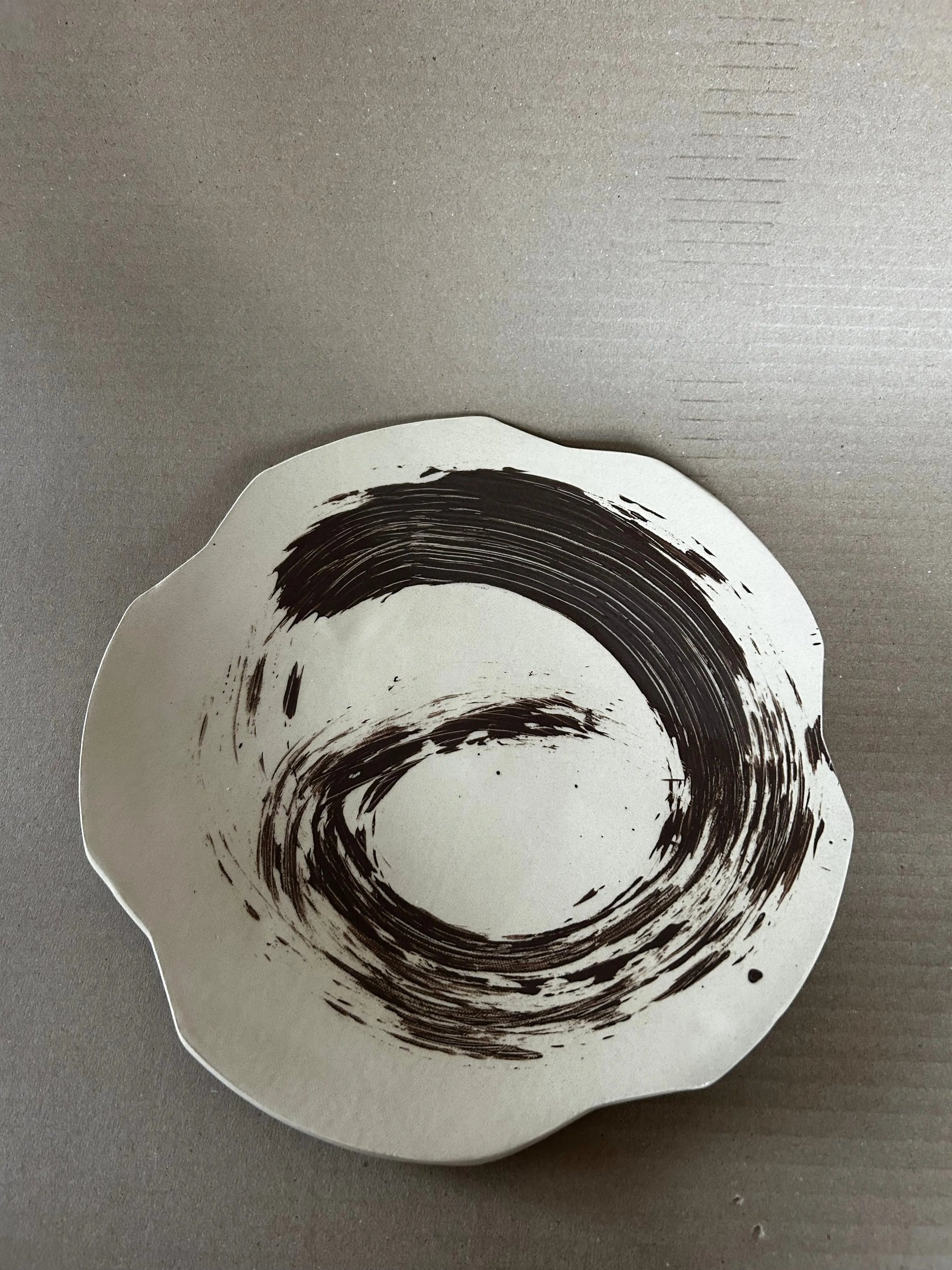 Plat ou assiette de présentation, en grès blanc lisse avec engobe chocolat posé au pinceau Hakémé, émaille transparent brillant