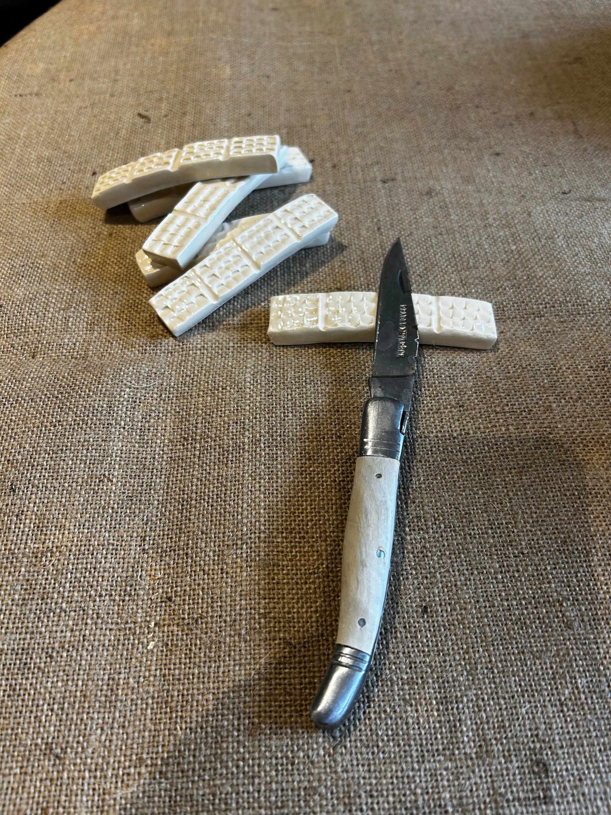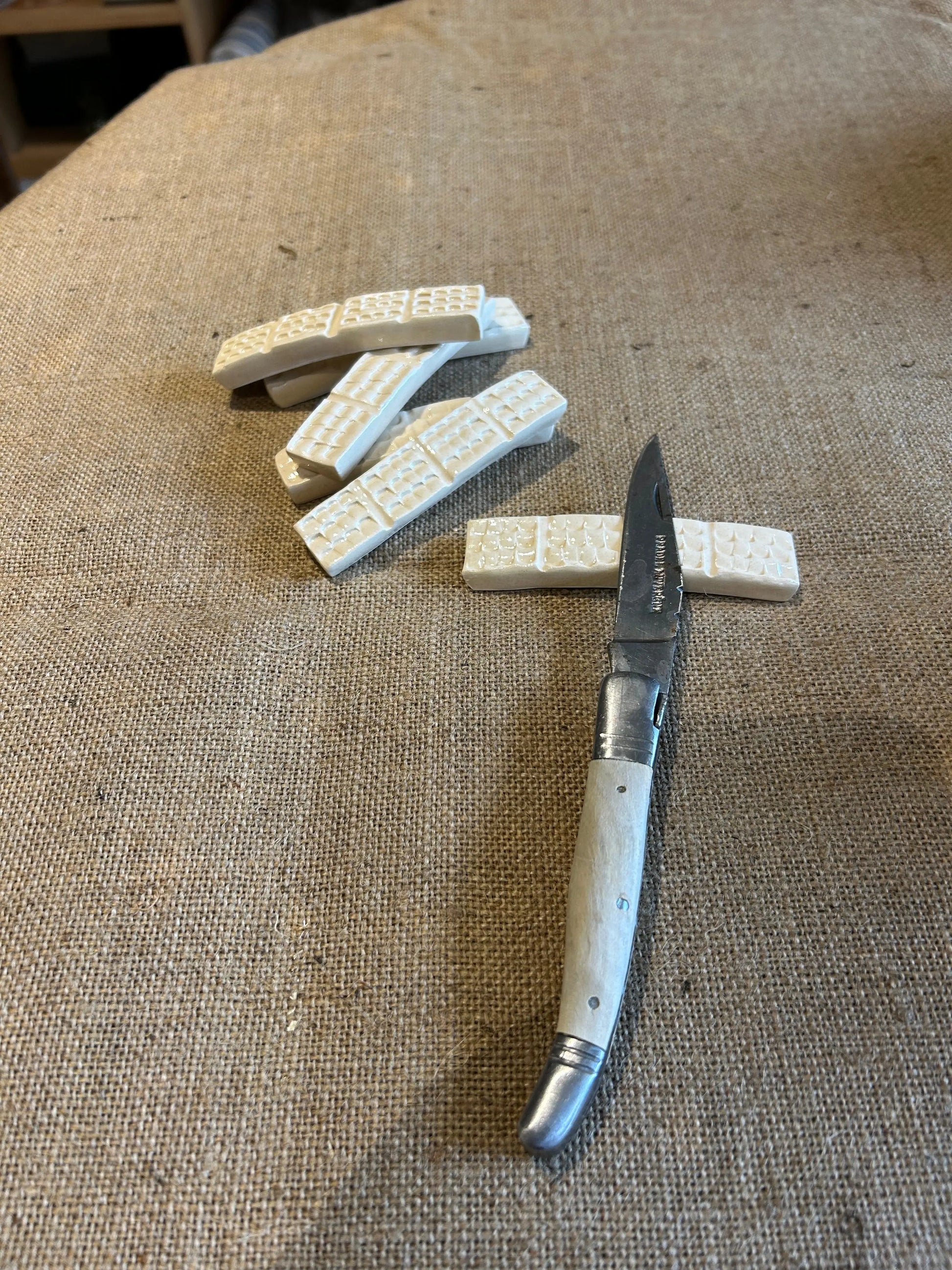 6 portes couteaux en grès blanc lisse et émaille blanc transparent.