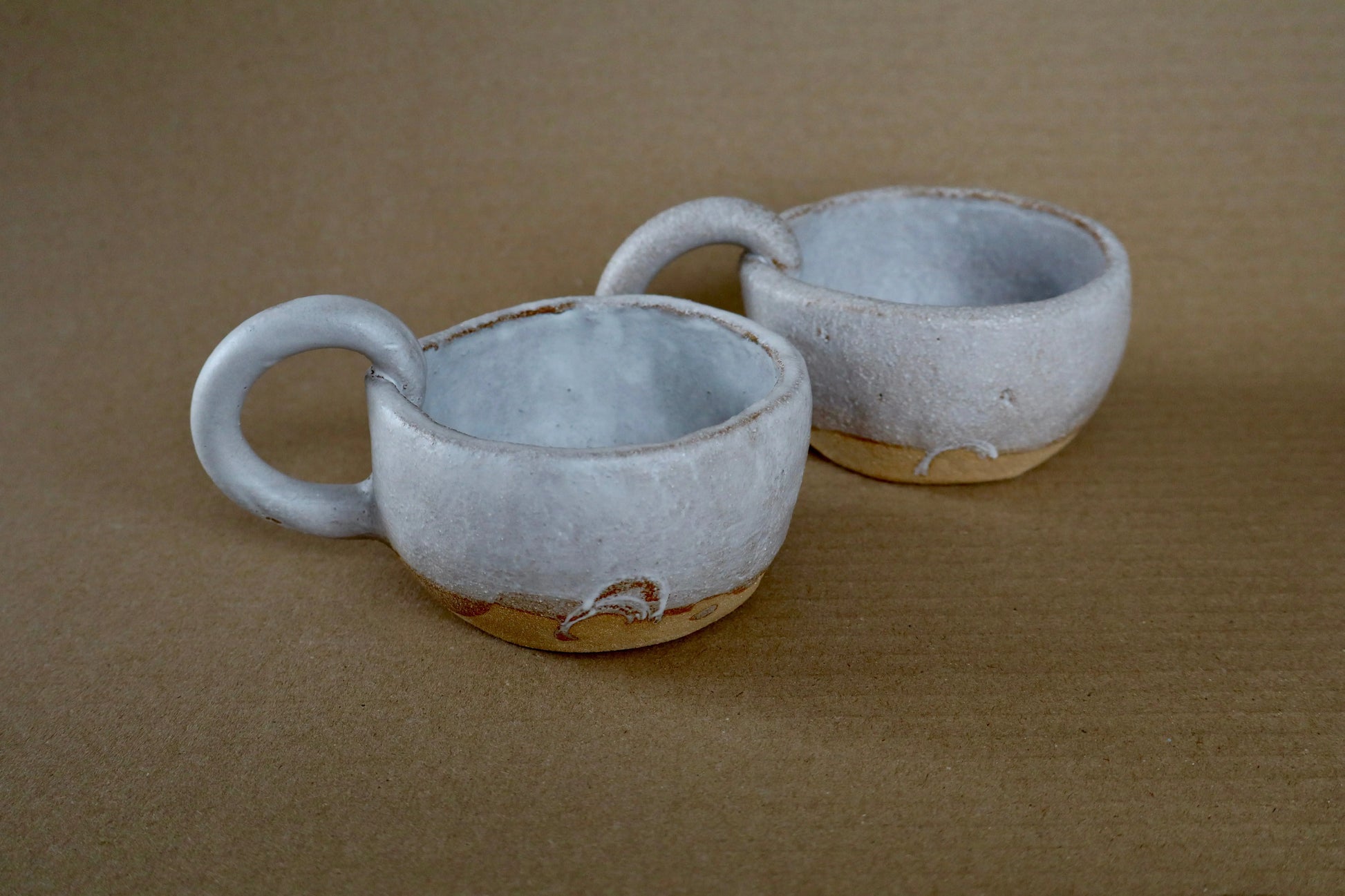 Je vous propose ces tasses avec anses en grès chamotté rouge, émaillées en blanc satiné.
